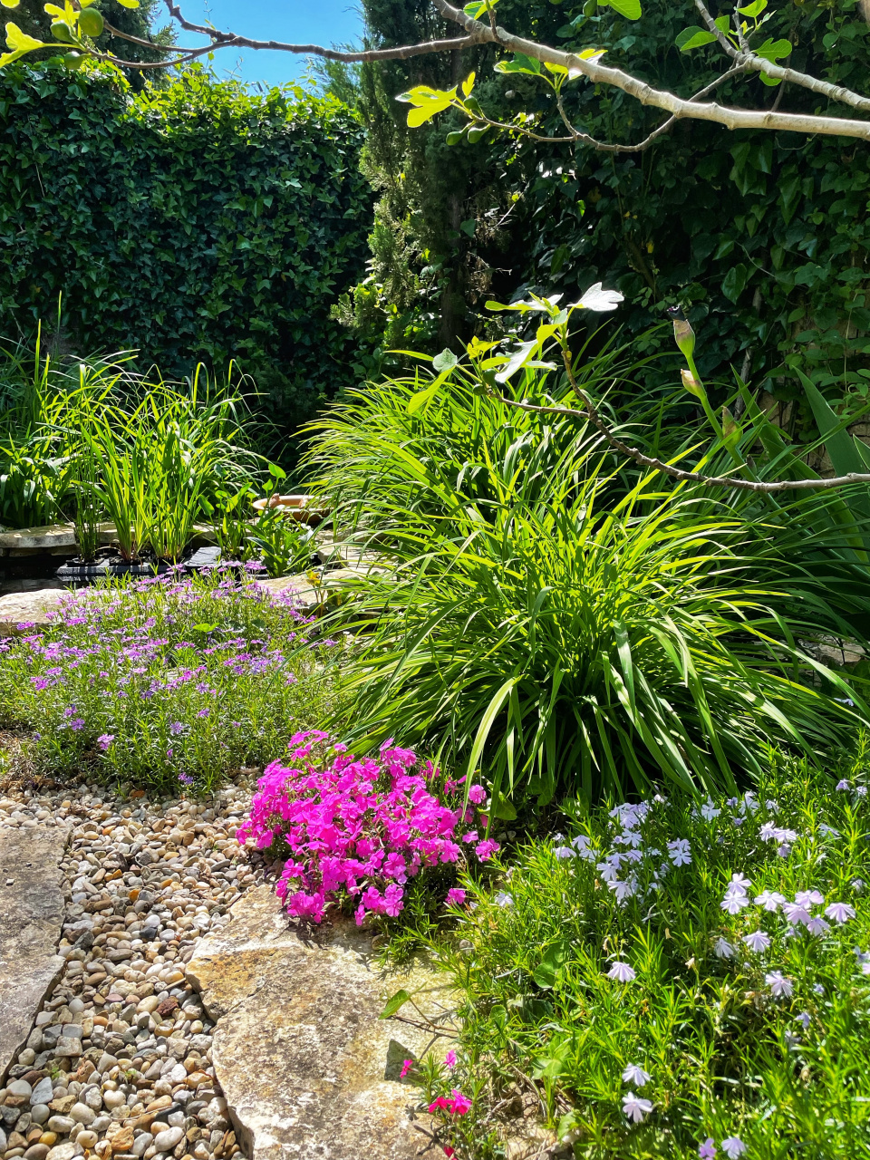 V zahradě chtěla mít majitelka všechny čtyři živly. Vodu zde zastupuje malé jezírko s několika rybkami.