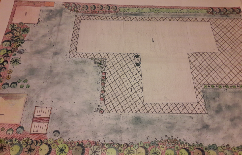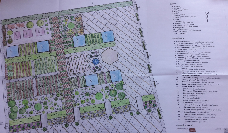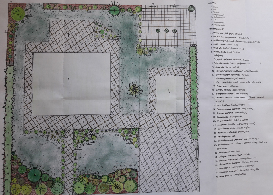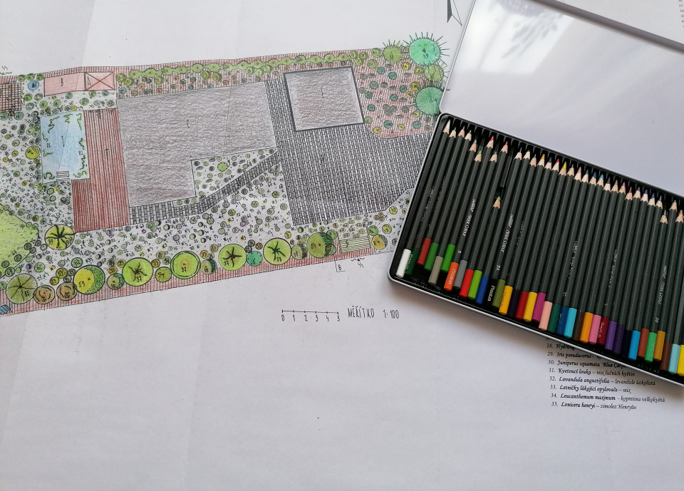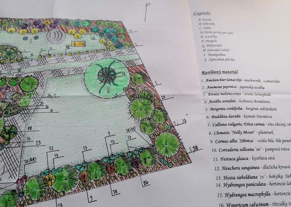 Ručně kreslený návrh zahrady musí být doplněn legendou
