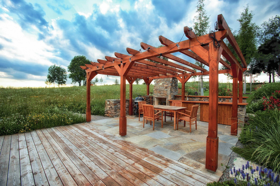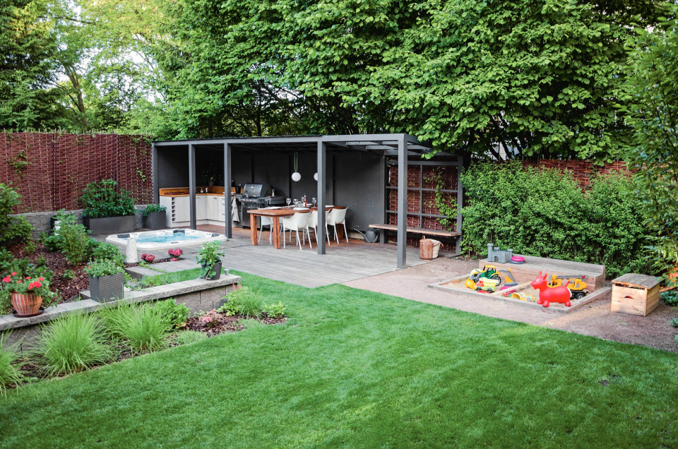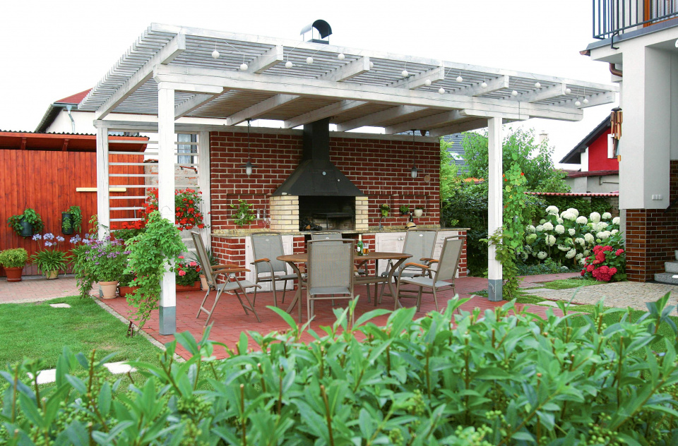 Vyhraďte si dostatek místa a zpevněte povrch venkovní jídelny. Trávník by tu dlouho nevydržel.