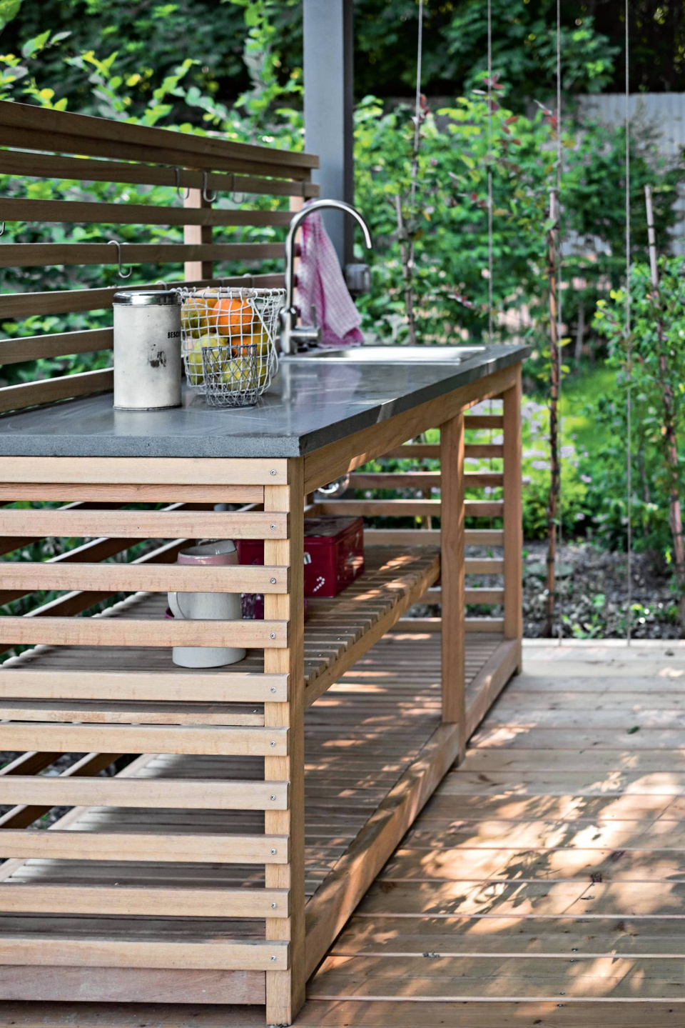 Krb jako základ venkovní kuchyně? Proč ne. Jen si vyhraďte dost místa na přípravu jídla: je praktické ji celou přenést ven.