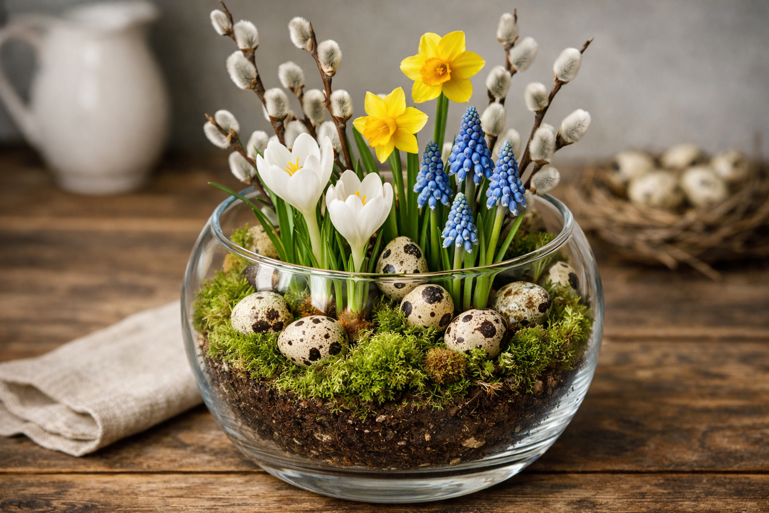 Základem je sytě zelený mech, který najdete na každém stinném rohu zahrady, a k němu přidejte pár drobných cibulovin, jako jsou modřenice nebo sněženky. Do sklenice se skvěle hodí i křepelčí vajíčka nebo vrbové větvičky, které dodají aranžmá tu správnou dávku velikonočního optimismu.