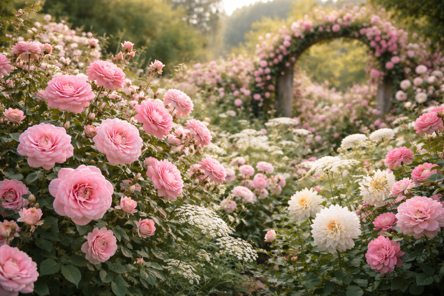 Ze všech odrůd růží mám nejraději ty v růžových odstínech. Růžová barva mi připadá pro růže nejpřirozenější a zároveň nejpestřejší. Fascinuje mě, kolik odstínů dokáže nabídnout. Od jemně pudrové přes starorůžovou až po hluboké, téměř vínové tóny. Ve své zahradě je ráda kombinuji se vzdušnými květy letniček v bílé barvě, jako je okrasná mrkev (Daucus carota), pakmín (Ammi majus) nebo paprska (Orlaya grandiflora), a doplňuji je i drobnokvětými bílými jiřinami (Dahlia). Právě v tomto kontrastu podle mě růžové odrůdy růží nejlépe vyniknou.