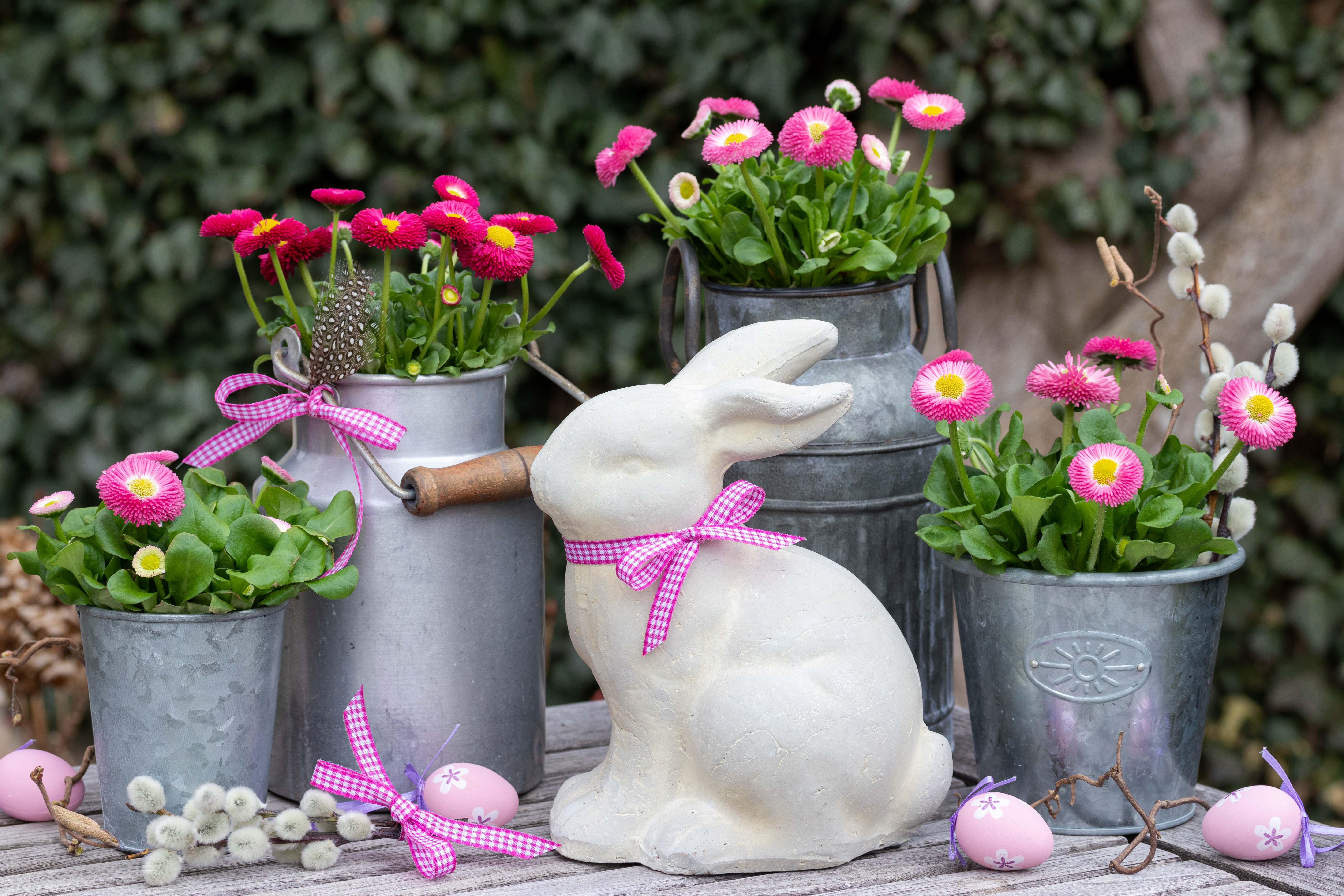Zahradní sedmikrásky (Bellis perennis), kterým se běžně říká plnokvěté sedmikrásky, jsou vyšlechtěné odrůdy původní, jednoduché sedmikrásky, kterou známe jako plevel z trávníků nebo jako drobnou luční květinku. Na rozdíl od ní však nabízejí bohatá, plná květenství v odstínech bílé, růžové, červené až vínové barvy. Některé kultivary mají květenství poloplná, jiné úplně plná, s kulovitým tvarem. Právě díky této „načančané“ podobě si vysloužily místo mezi nejoblíbenějšími velikonočními květinami. Skvěle ladí s jarními cibulovinami, jako jsou tulipány (Tulipa), hyacinty (Hyacinthus) nebo narcisy (Narcissus), a společně vytvářejí kouzelně romantické kompozice.