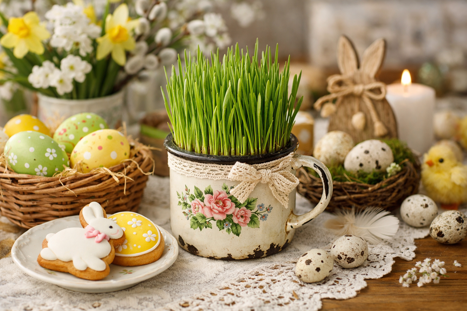 Stačí pár semínek pšenice, starý hrnek nebo skořápka – a velikonoční osení se promění v krásnou jarní dekoraci.