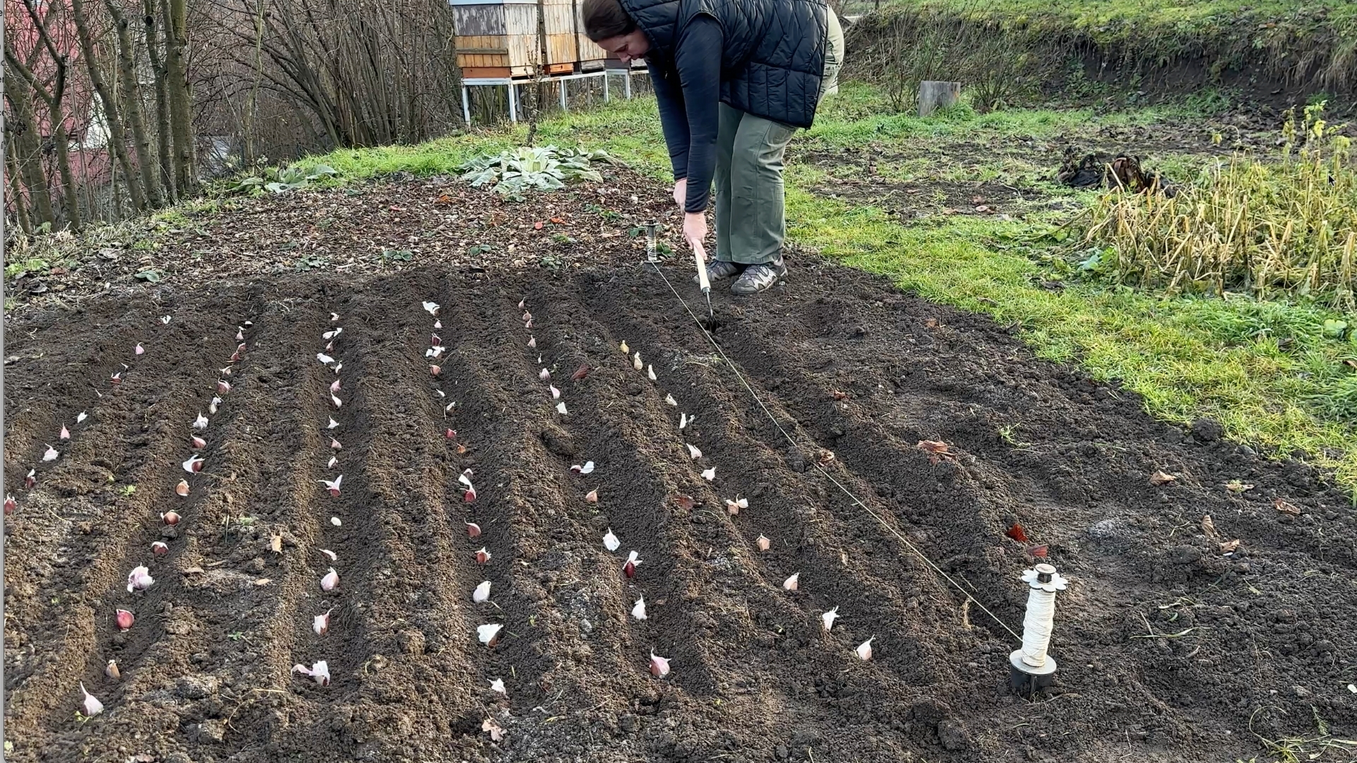 - Správné sázení: POZOR – nepoužívejte sázecí kolík! Pod stroužkem by mohla vzniknout vzduchová bublina a česnek pak snadno vyschne. Místo toho vezměte stroužek mezi prsty a zatlačte ho špičkou nahoru do hloubky 5–10 cm.