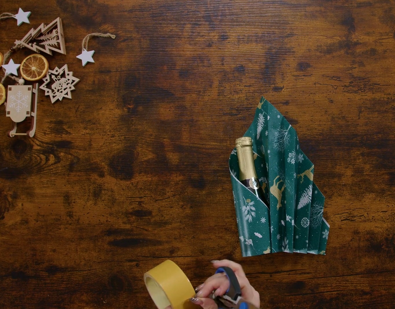 Balení lahve netradičním způsobem je zajímavým nápadem. Papír je kolem ní složen do vrstev, které připomínají větve vánočního stromku. Jde o techniku, která působí luxusně, ale zvládne ji opravdu každý.