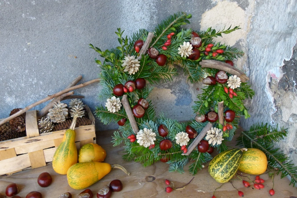 Ze stejných rostlin jako svícen snadno vytvořte i věneček, do kterého pak posadíte pěkně vybarvenou menší dýni. Může to být například oblíbené hokaido, které jste sklidili ze zahrady, ale zakoupíte ho i v každém supermarketu. Rostliny a plody můžete jednoduše navazovat na slaměný základ věnečku tenkým provázkem nebo vázacím drátkem. Vzhledem k použitému materiálu bude věneček krásný i po úplném zaschnutí.