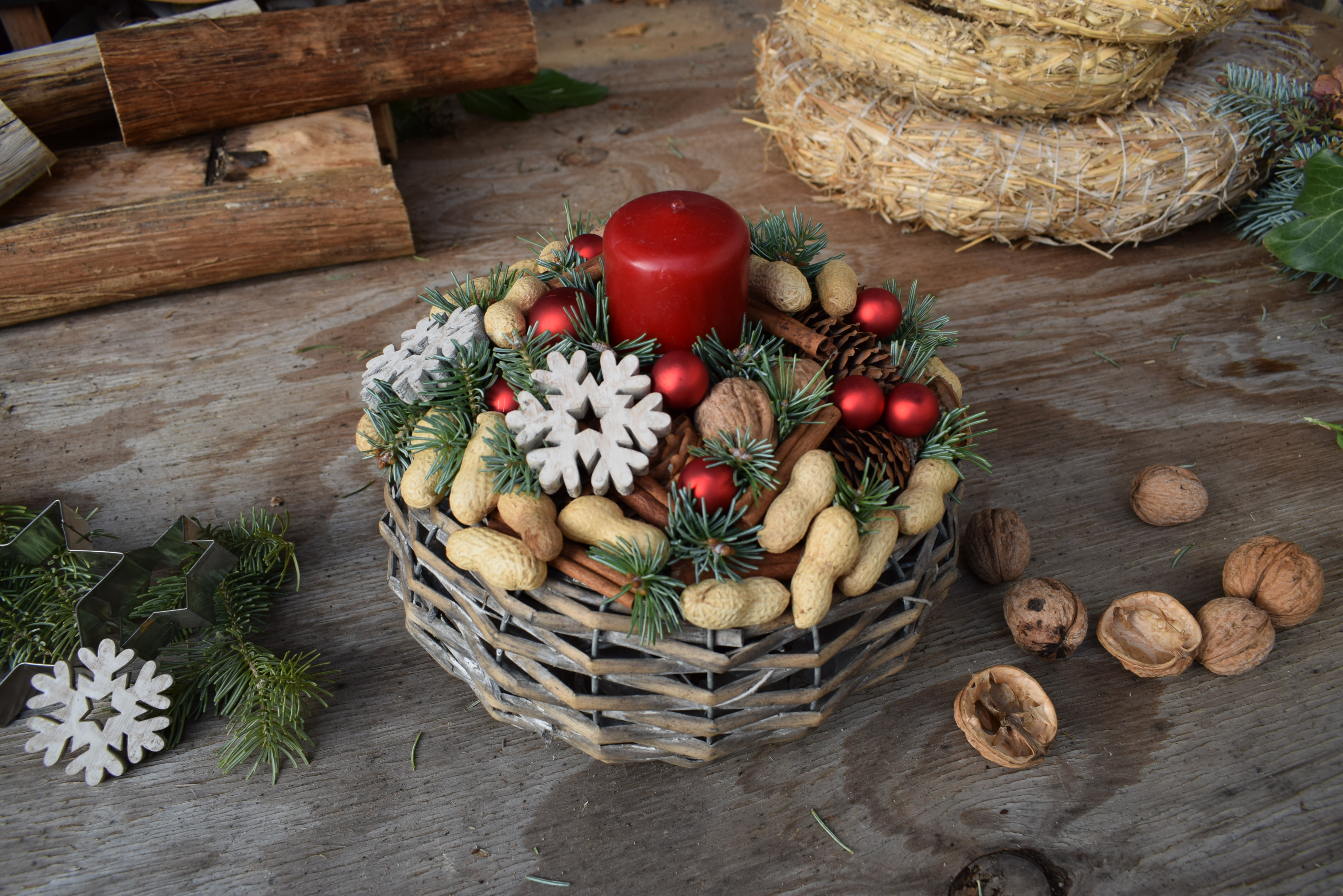 Vánoční svícny nemusí být složité ani drahé. Někdy stačí proutěný košík, pár nasbíraných šišek a několik drobných ozdob, které máte doma po ruce. Právě přírodní materiály dodávají dekoraci nejen útulný vzhled, ale i jemnou vůni lesa a koření, která k zimnímu období neodmyslitelně patří. Smrkové šišky poslouží jako výplň košíku a zároveň neutrální vizuální pozadí, burské a vlašské ořechy dodají celku hřejivý rustikální charakter a svitky skořice vše zabalí do typicky vánoční atmosféry.