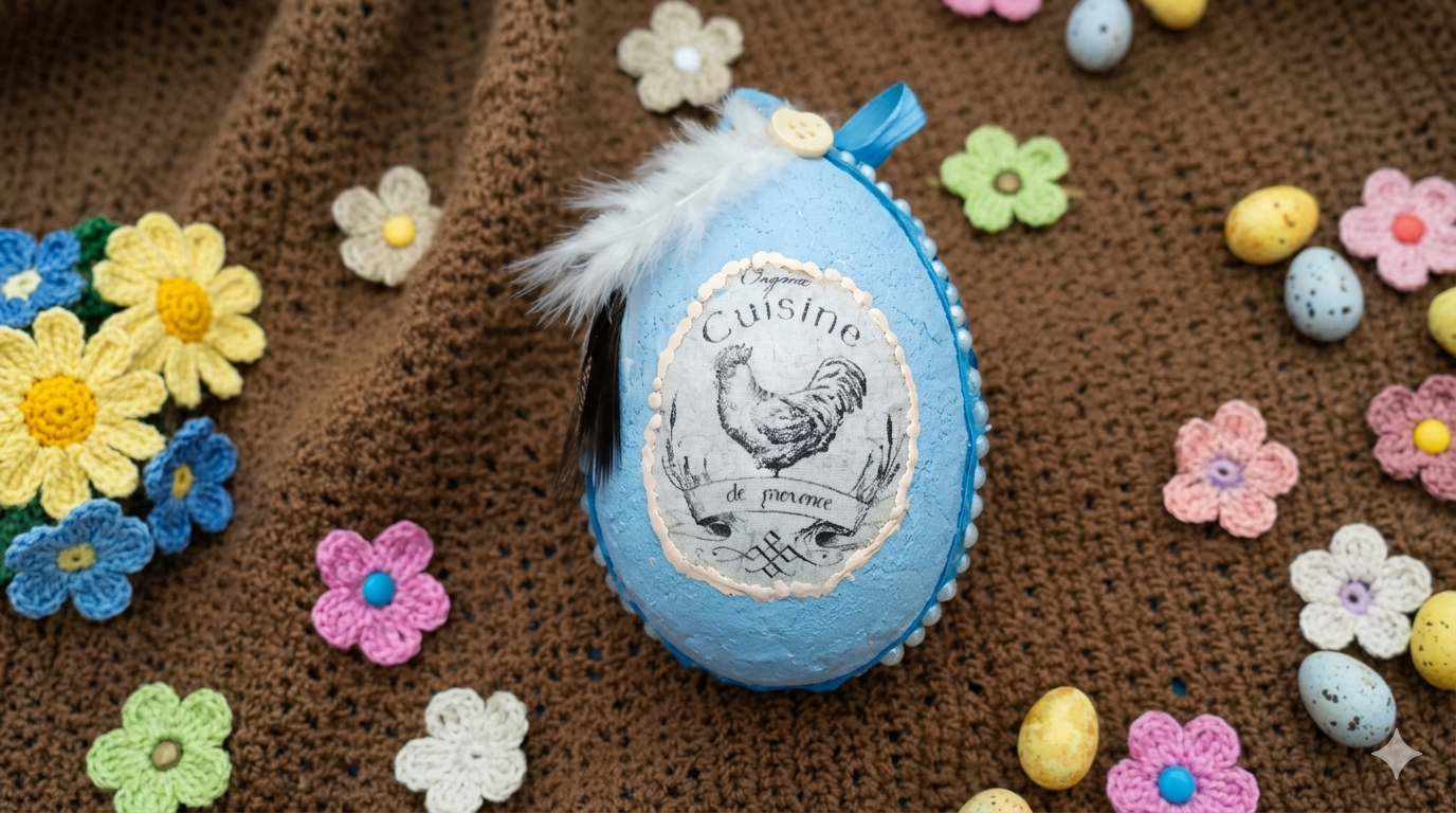 Najděte si na internetu motiv, co zavání Francií. Já sáhla po kohoutovi a nápisu Cuisine de Provence. Vytiskněte si ho, vystřihněte a teď to nejdůležitější: pořádně ho zmačkejte do kuličky, aby po narovnání získal ty správné vrásky. Takto připravené ho nalepte do středu vejce a pořádně ho uhlaďte.