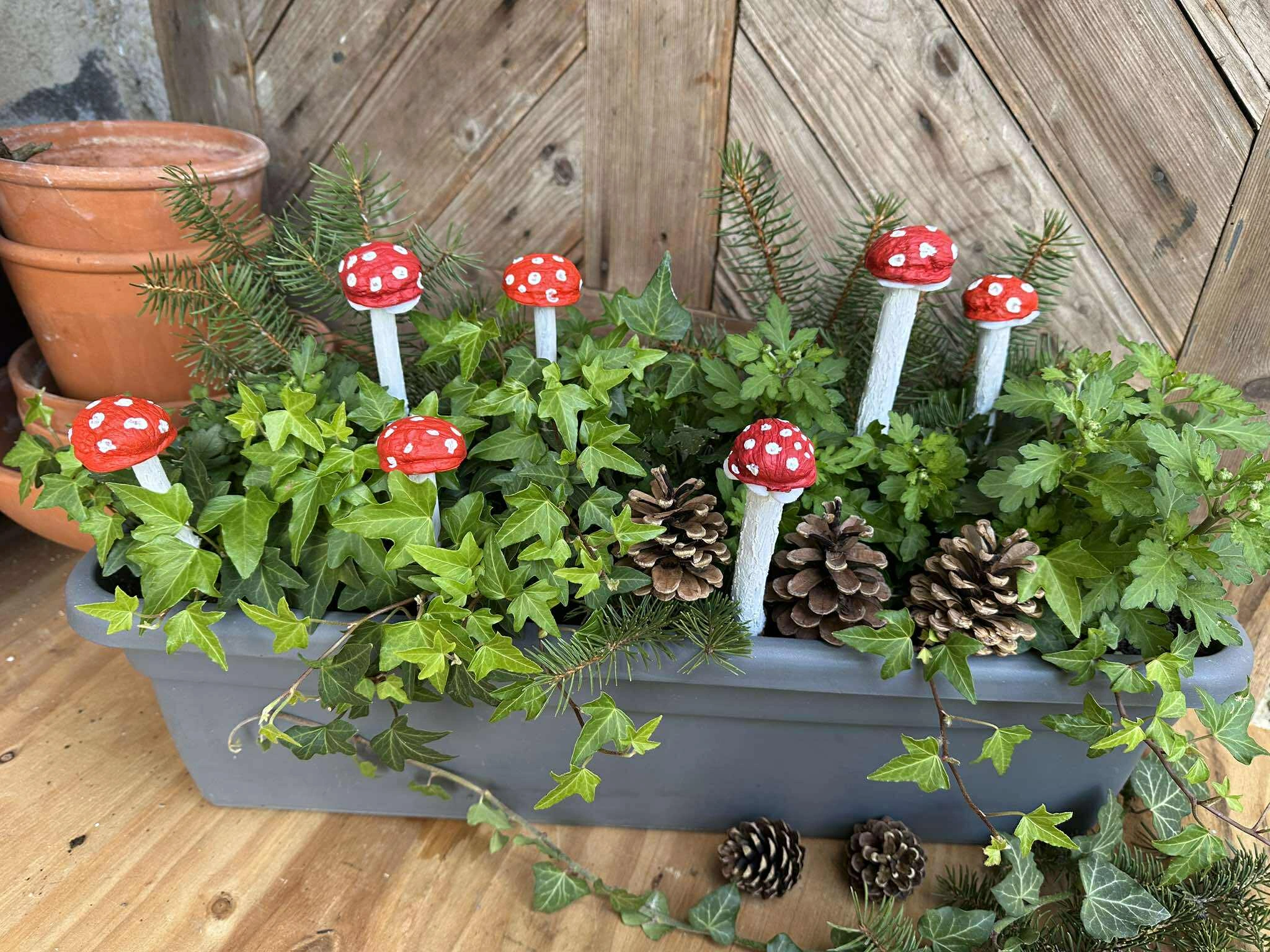 Chladné měsíce ani zdaleka nemusí znamenat konec barevné výzdoby oken a balkonů. I když naprostá většina květin odpočívá a nekvete, můžete si vytvořit podzimní dekorace, díky kterým bude truhlík působit svěže od podzimu až do jara. Stačí vsadit na stálezelené rostliny, a mezi ně zapíchat zářivě barevné muchomůrky ze skořápek vlašských ořechů.