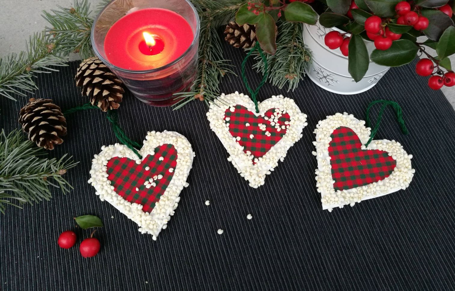 Kromě kuchyně ale mohou jáhly najít uplatnění i jinde. Například v rukodělných vánočních dekoracích. Díky své velikosti, barvě i přírodnímu vzhledu krásně doplňují slámu, dřevo, sušené rostliny nebo obyčejný provázek. A právě proto získaly prostor i na vánočních srdíčkách z kartonu, která ozdobí dárky nebo stromek s jemnou, až starosvětskou elegancí.
