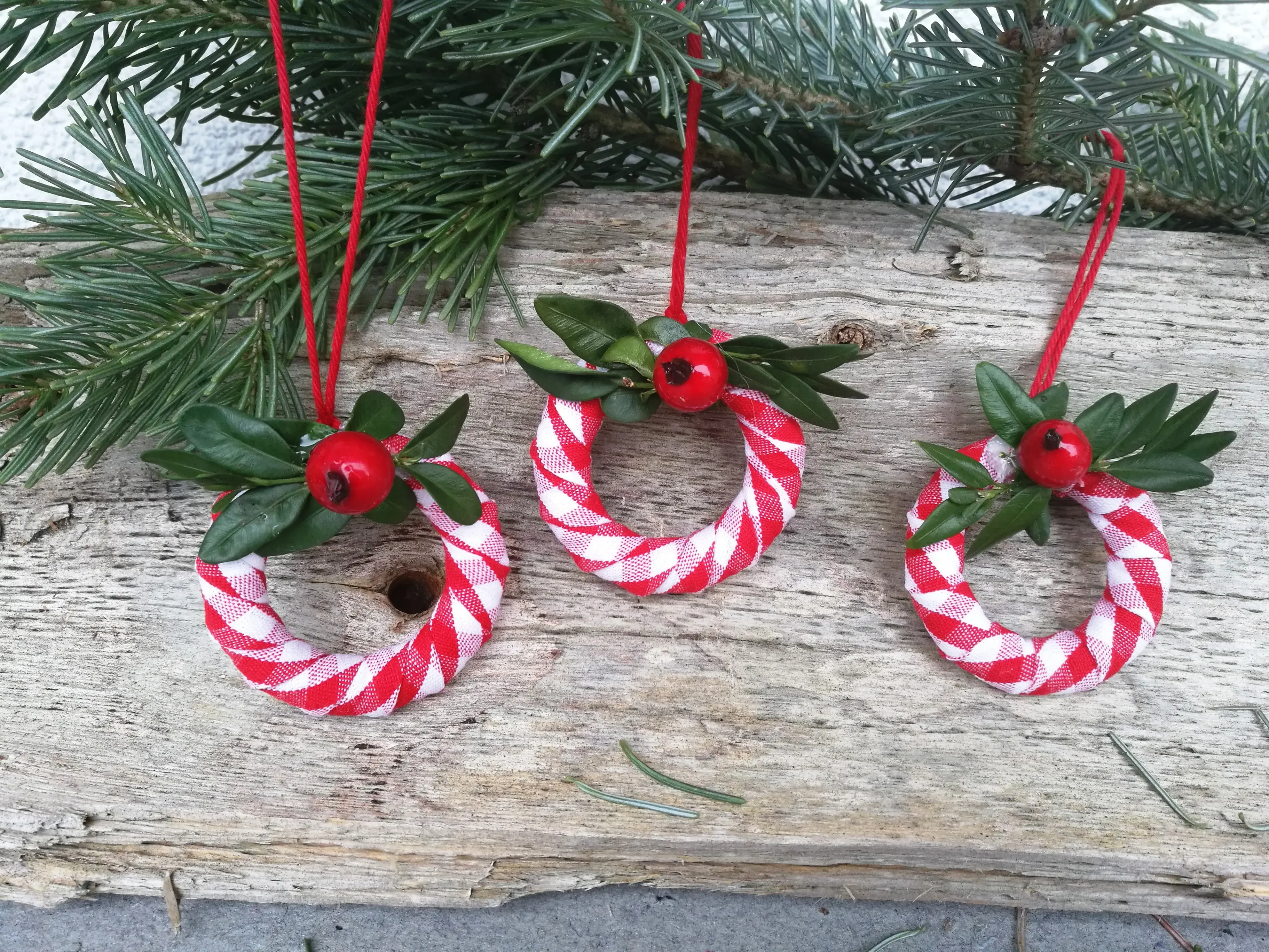 - Z tenké červené stužky vytvořte očka na zavěšení ozdob na stromek.