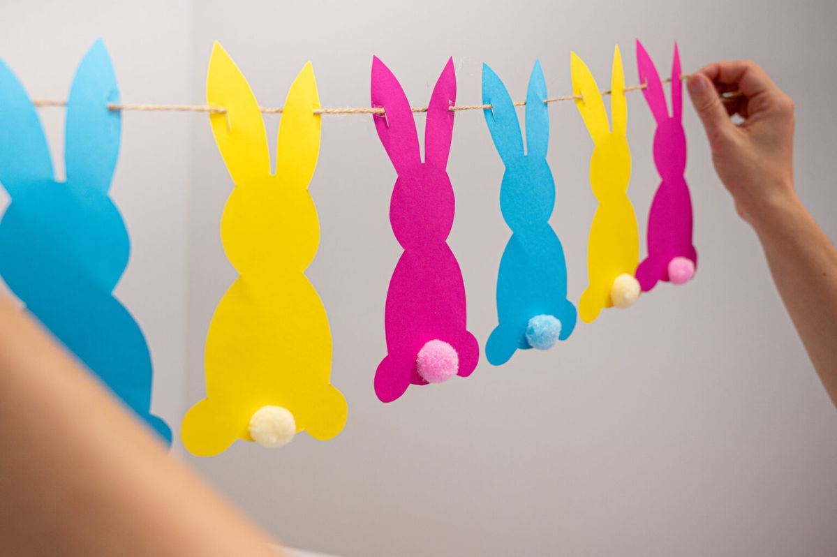 Zaječí girlandu můžete vytvořit buď z papíru nebo z látky či filcu. Budete potřebovat šablonu, tužku, papír nebo látku, nůžky, lepidlo, dekorativní bambulky na ocásky a provázek. Jak postupovat: