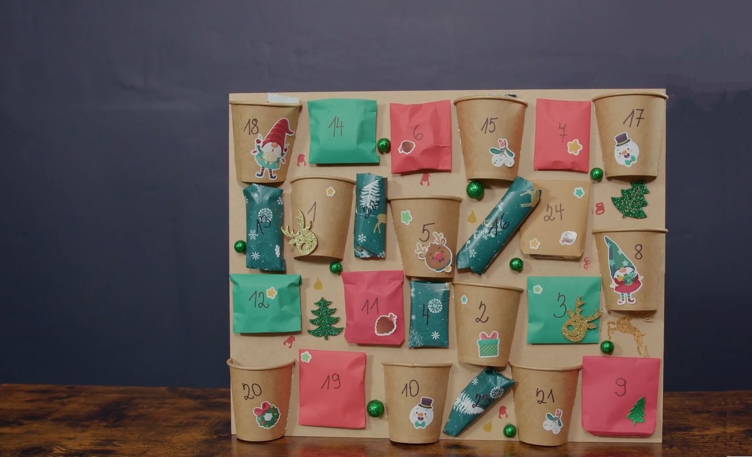 Nebo použijte obyčejné papírové kelímky a kus kartonu. Neuvěříte, že i z takového nezajímavého materiálu lze adventní kalendář vyrobit.
