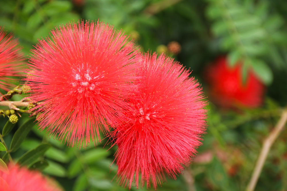 Kaliandra suriamská (Calliandra haematocephala) vypadá jako živý ohňostroj. Její květy tvoří kulaté chomáče jemných tyčinek v červených a růžových odstínech a připomínají plyšové koule na stopkách. Je menší než albízie, takže se skvěle hodí i do nádob nebo zimních zahrad.